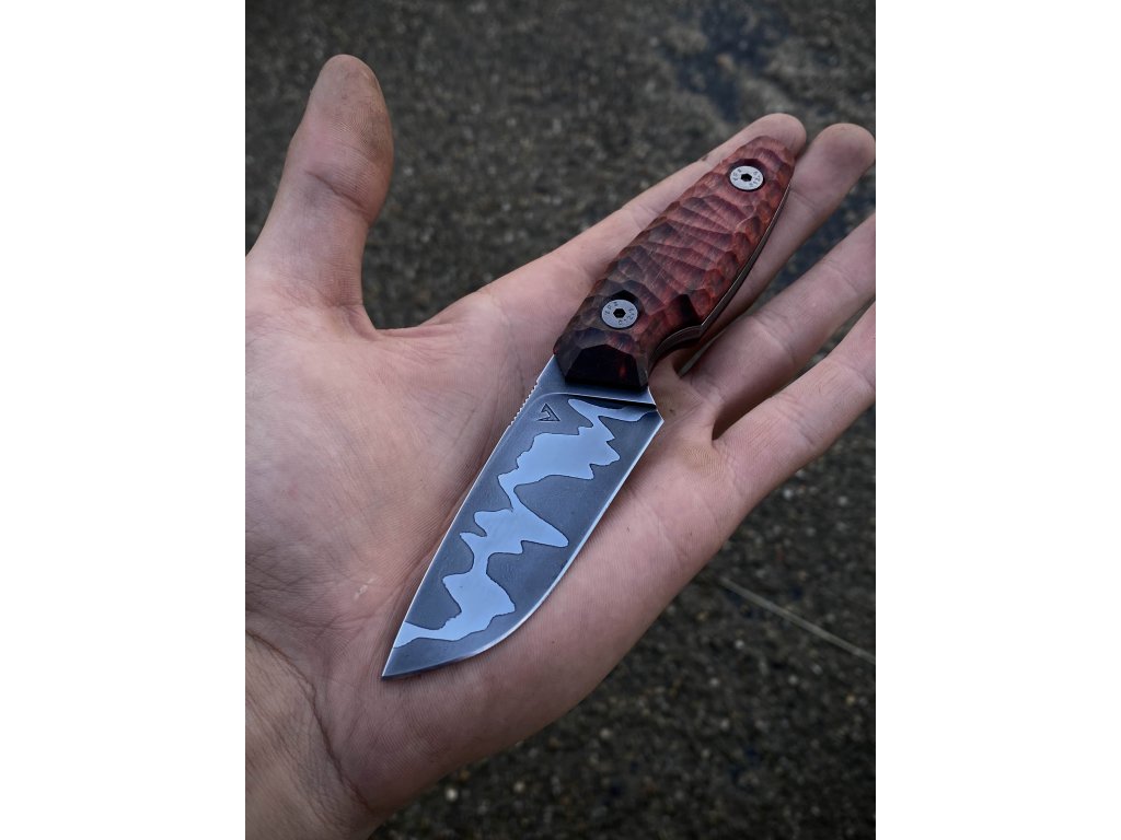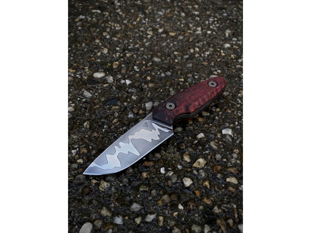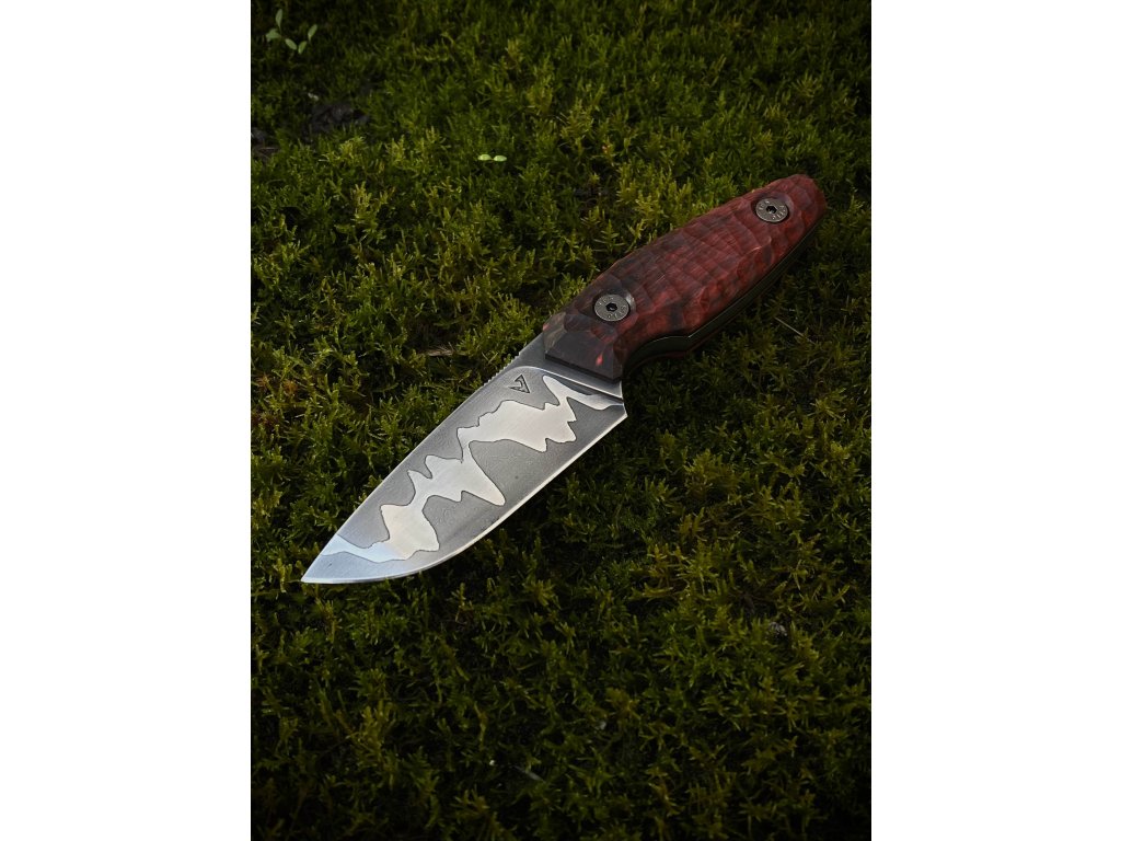 Rukojeť ze stabilizované břízy s červeným pigmentem dodává noži jedinečný vzhled a ergonomický tvar zajišťuje pohodlný úchop. Střenky jsou zpevněny spacerem z G10 a uchyceny černěnými nerez šroubky.